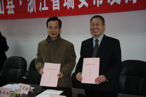 考察期间,瑞安市工商联与名山县工商联签订了关于建立友好商会关系的协议书。赵志雄说,名山是一座历史名城,发展潜力大;瑞安是一座江南名城,经济实力雄厚,双方独具特色。友好商会协议的签订旨在加强双方之间的沟通与交流、合作与发展,充分发挥两地的资源优势。王安文对双方缔结友好商会表示祝贺,希望能进一步加强双方的合作往来,共同为促进两地经济社会的和谐发展贡献力量。他说,此次友好商会协议的签订不仅是一次决策性的合作,更是给名山县带来了一次难得的学习机会。名山县工商联将充分借鉴瑞安经济建设的好经验,吸取瑞安市工商联立会的好方法,取长补短,不断加强县工商联自身建设,推动名山经济的快速发展。