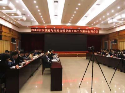 11月15日下午,2018年市政府和市政协领导班子第二次集体协商会议在市政大院多功能厅召开,就加快西部生态休闲产业带建设助力乡村振兴开展专题协商。市长麻胜聪、市政协主席管秀云,副市长周晓华、项金敏,市政协副主席倪希杰、陈荣臻、钱定荣、吴功宜等参加会议。