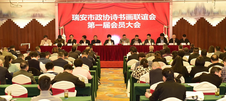 4月17日,瑞安市政协诗书画联谊会第一届第一次会员大会召开,市政协主席管秀云参加活动,会议由市政协副主席陈良明主持。