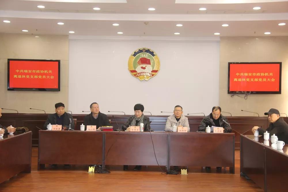 1月17日,瑞安市政协机关离退休党支部召开党员大会。会议由市政协副主席陈荣臻主持,市政协主席、党组书记管秀云,市政协机关离退休党支部书记林锦麒,十一、二届政协主席、市慈善总会会长白一帆,市政协秘书长、机关党组书记项贻康以及31名离退休党支部党员参加会议。