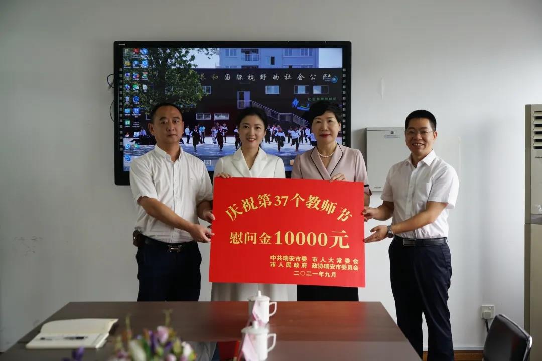在第37个教师节来临之际,瑞安市政协主席管秀云、市委副书记胡立左一行先后来到玉海中心小学和塘下镇鲍田中学,向广大教师送去节日问候和美好祝福,并看望慰问了浙江省教坛新秀徐婕妤、王盈盈两位老师。